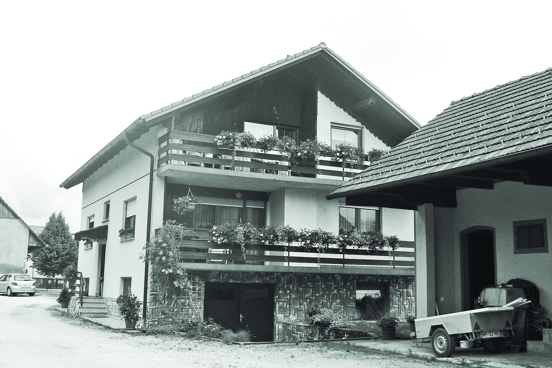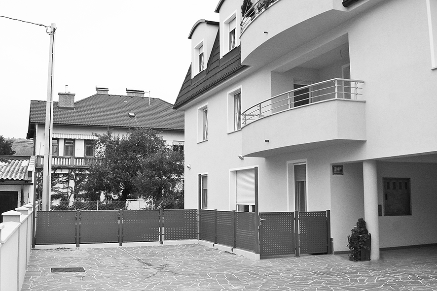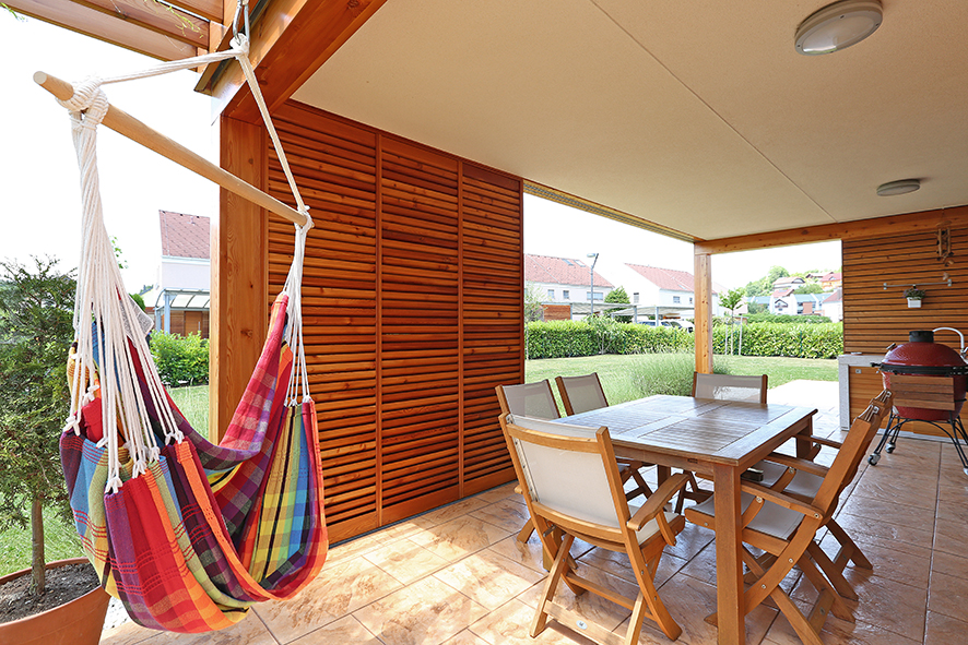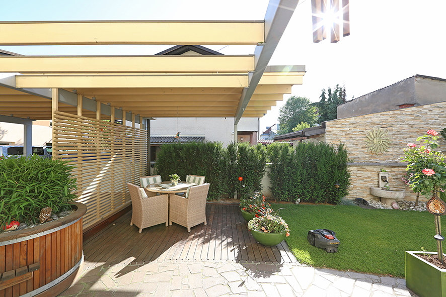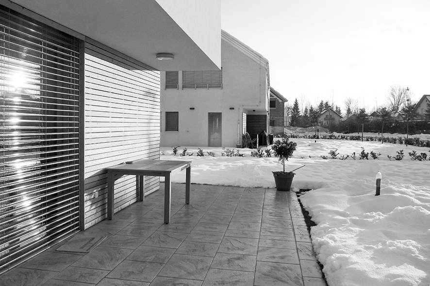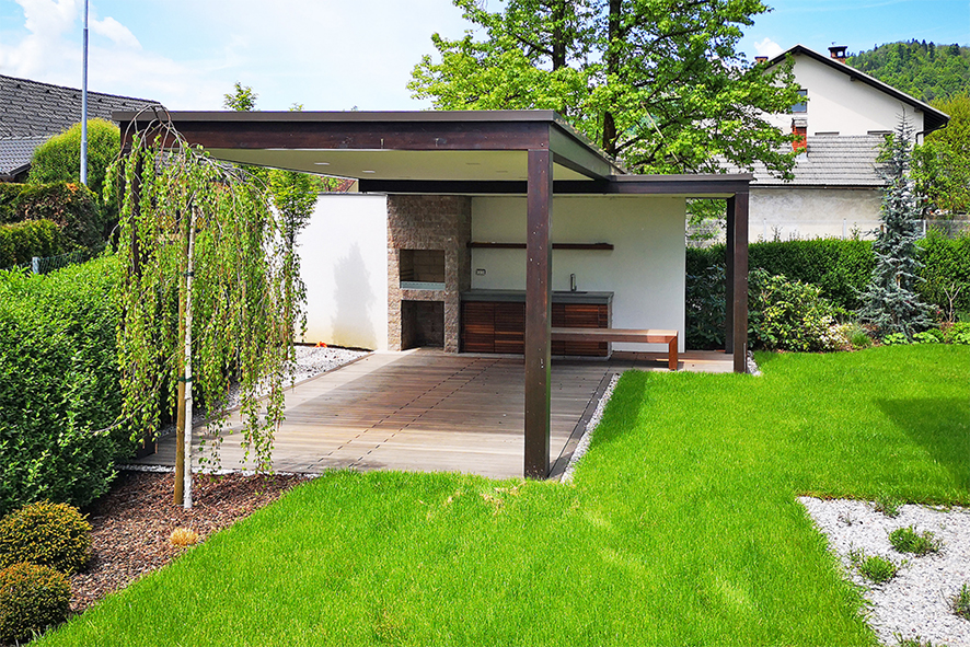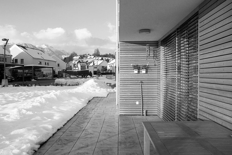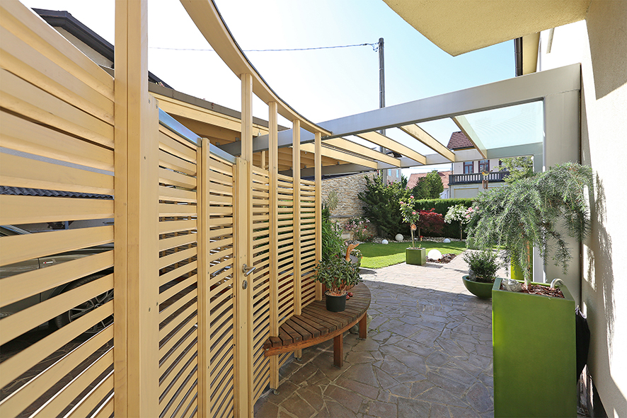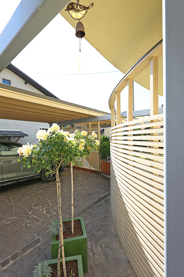 Primer iz Rožne doline je prispodoba slikarske umetnine, polne nasprotij, ki delujejo v skladnem ravnovesju. Ozek pas ob večstanovanjski stavbi je na željo lastnikov potreboval pokrit parkirni in bivalni del. Oblikovanje zaščite za avtomobil in vrtno garnituro je pripeljalo do estetske in funkcionalne rešitve – nadstreška, ki pod eno streho združuje oboje. Vrtni lopi na drugi strani hiše pa shranjujeta opremo za urejanje okolice in gojenje rastlin. Fotografije in tekst: Špela Pavlič Kos Načrtovanje: Jože Kos, Mizarstvo Kos Mizarska dela: Mizarstvo Kos Krovsko-kleparska dela: Stavbno kleparstvo in krovstvo, Gregor Lamovšek s.p. Steklarska dela: Steklarstvo Vidmar