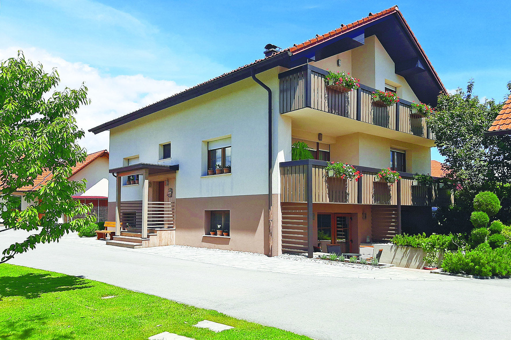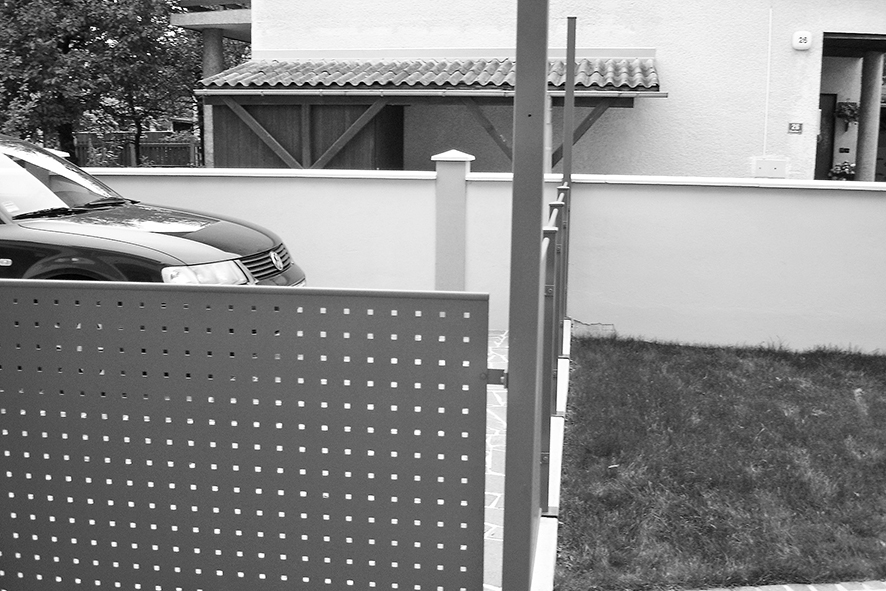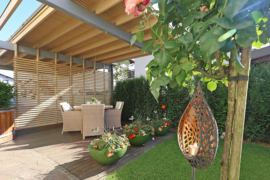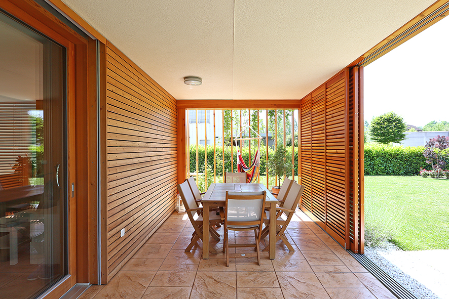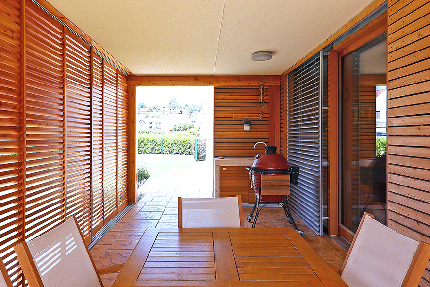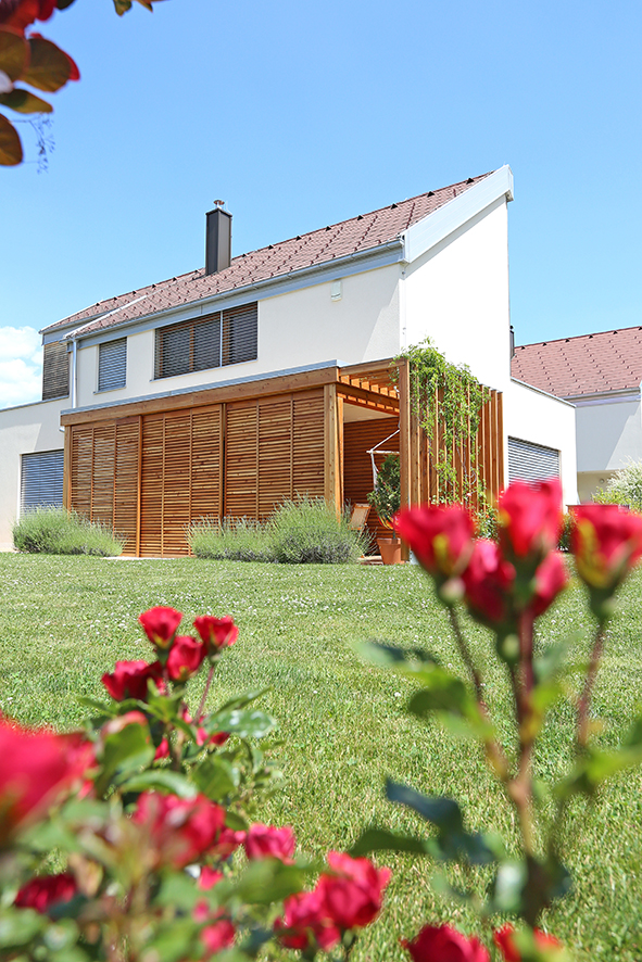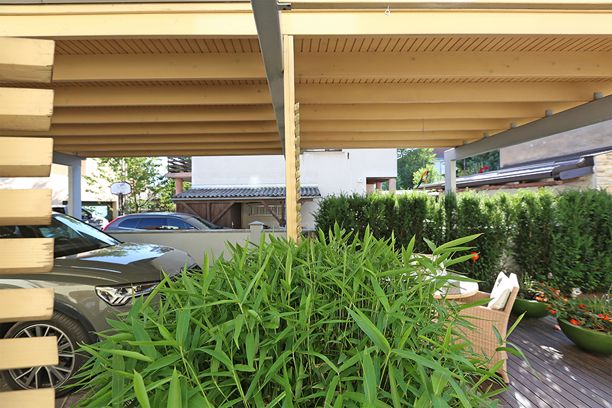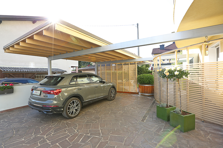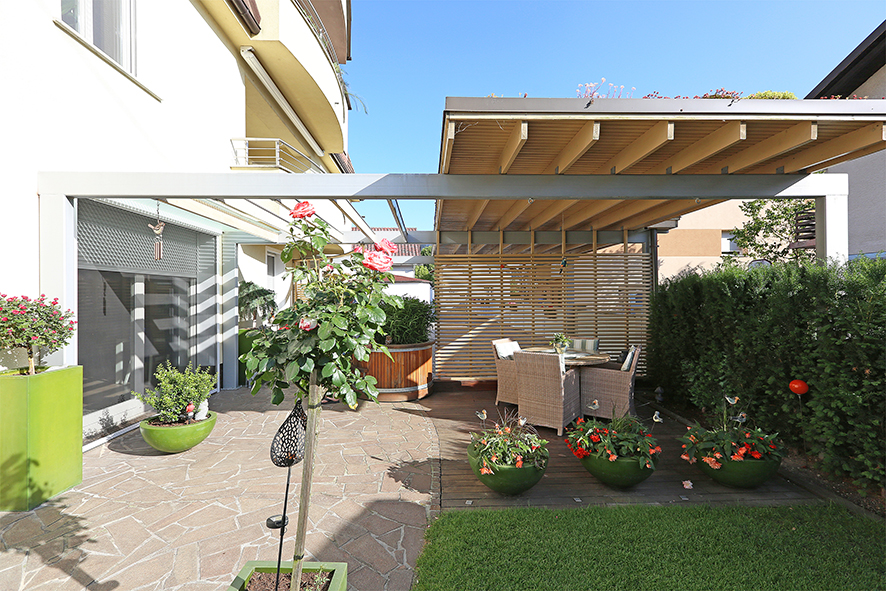 Primer iz Rožne doline je prispodoba slikarske umetnine, polne nasprotij, ki delujejo v skladnem ravnovesju. Ozek pas ob večstanovanjski stavbi je na željo lastnikov potreboval pokrit parkirni in bivalni del. Oblikovanje zaščite za avtomobil in vrtno garnituro je pripeljalo do estetske in funkcionalne rešitve – nadstreška, ki pod eno streho združuje oboje. Vrtni lopi na drugi strani hiše pa shranjujeta opremo za urejanje okolice in gojenje rastlin. Fotografije in tekst: Špela Pavlič Kos Načrtovanje: Jože Kos, Mizarstvo Kos Mizarska dela: Mizarstvo Kos Krovsko-kleparska dela: Stavbno kleparstvo in krovstvo, Gregor Lamovšek s.p. Steklarska dela: Steklarstvo Vidmar