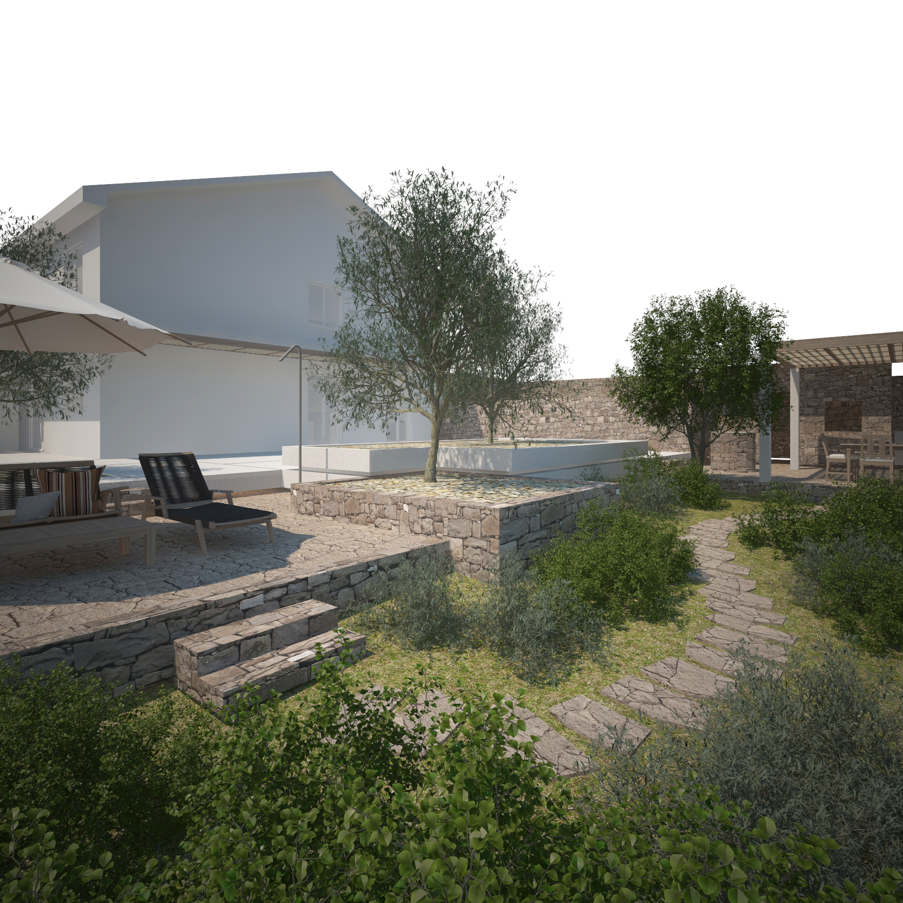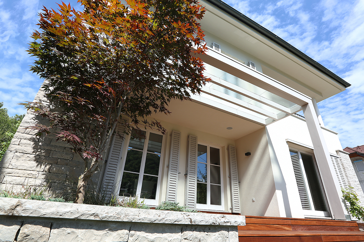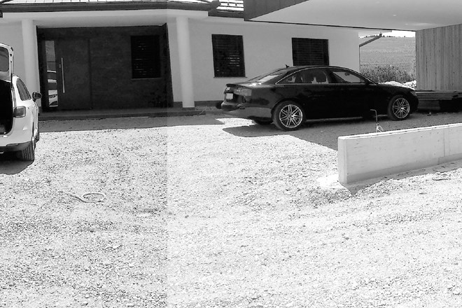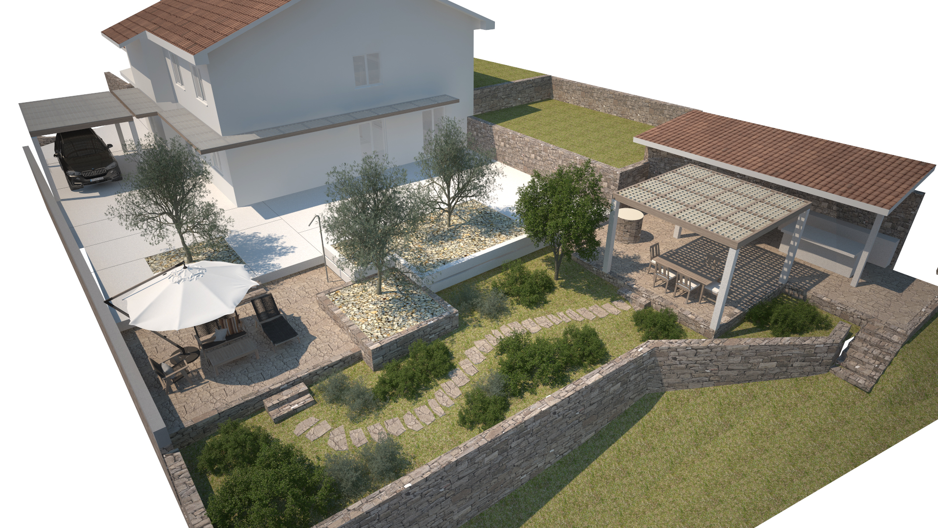 Starejši par si je želel popolne prenove zunanje ureditve svoje hiše in pritličja. Predvidena uporaba pritličja in vrta za prosti čas. Njihovo željo smo prilagodili minimalnemu vzdrževanju zunanje ureditve s trajno opranim in brušenim pločnikom iz belega cementnega betona in z naravnim lokalnim kamnom - „škrle“. Ohranili smo zimzelene in trajne rastline zelenja, ki postopoma prehaja v bližnji gozd. Poseben parametrični modularni strešni sistem je bil razvit za macesnove nadstreške okoli hiše in nad letno kuhinjo.