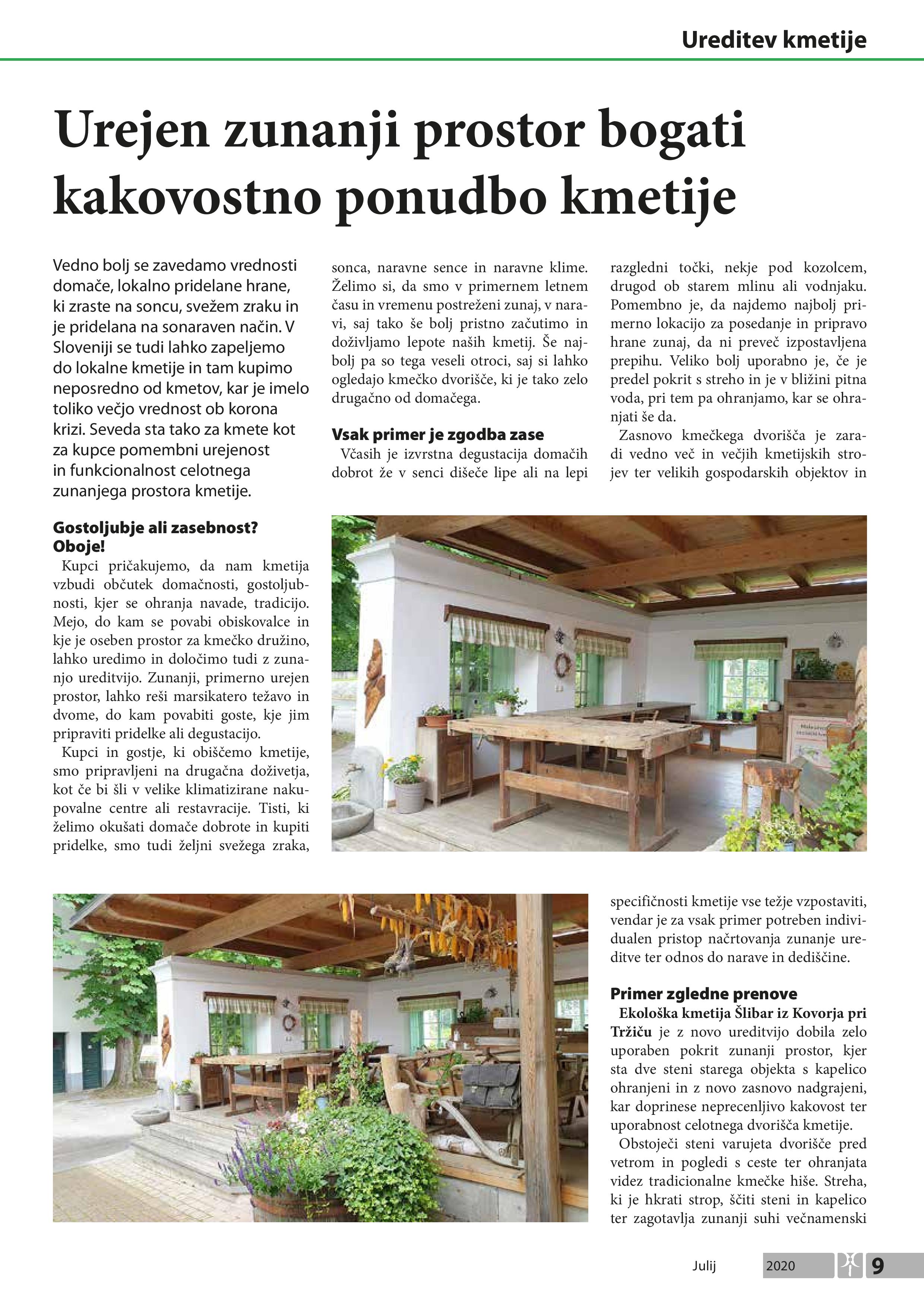 Vedno bolj se zavedamo vrednosti domače, lokalno pridelane hrane, ki zraste na soncu, svežem zraku in je pridelana na sonaraven način. V Sloveniji se tudi lahko zapeljemo do lokalne kmetije in tam kupimo neposredno od kmetov, kar je imelo toliko večjo vrednost ob korona krizi. Seveda sta tako za kmete kot za kupce pomembni urejenost in funkcionalnost celotnega zunanjega prostora kmetije.