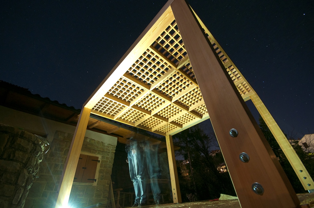 Lesen paviljon je del prenove zunanje ureditve hiše na Primorskem. Streha paviljona je narejena z modularnim satovjem iz macesna in služi za senčenje ali kot opora za rastline plezalke. Na streho je možno dodati tudi dodatno zaščito pred dežjem. Na vzhodni stranici je postavljena drsna stena, ki ščiti pred uličnimi pogledi in dopoldanskim soncem.