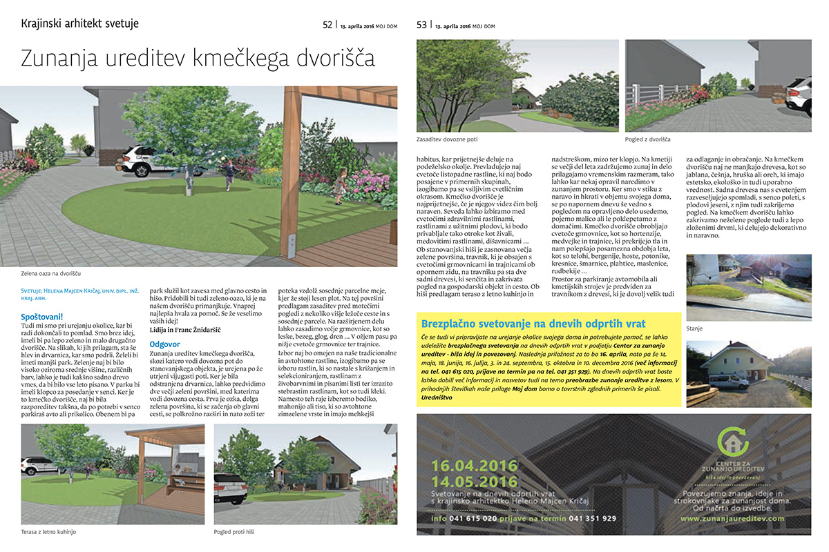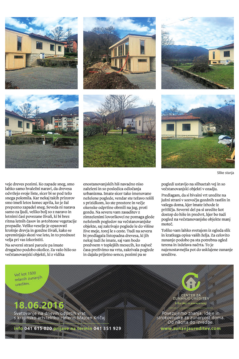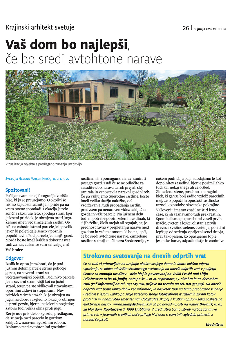 Poglejte včerajšnji izid članka in vizualizacije predlagane zunanje ureditve. Krajinska arhitektka Helena, tudi naša svetovalka na dnevih odprtih vrat, poudarja pomembnost avtohtone narave in njenih rastlin skozi vse letne čase.