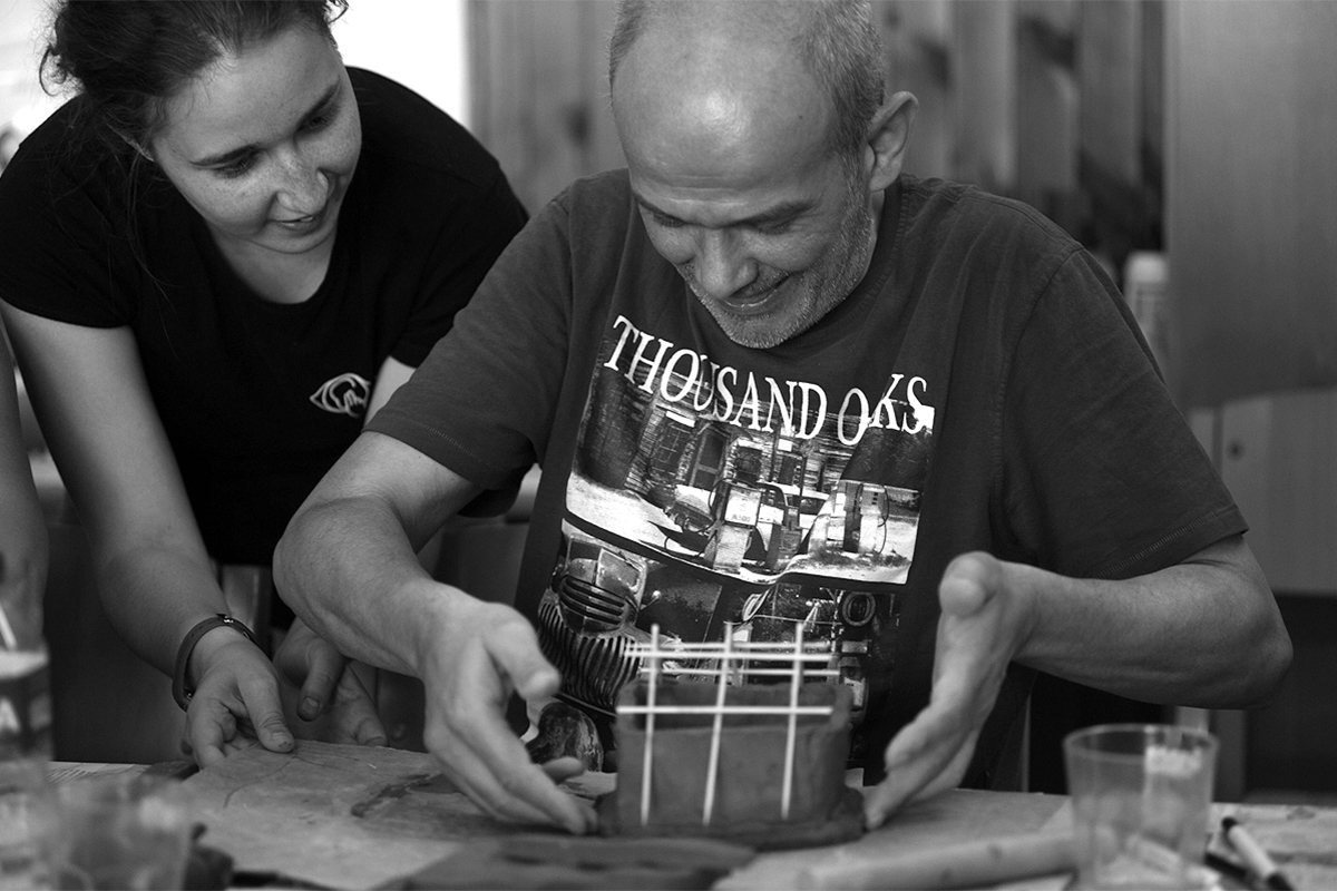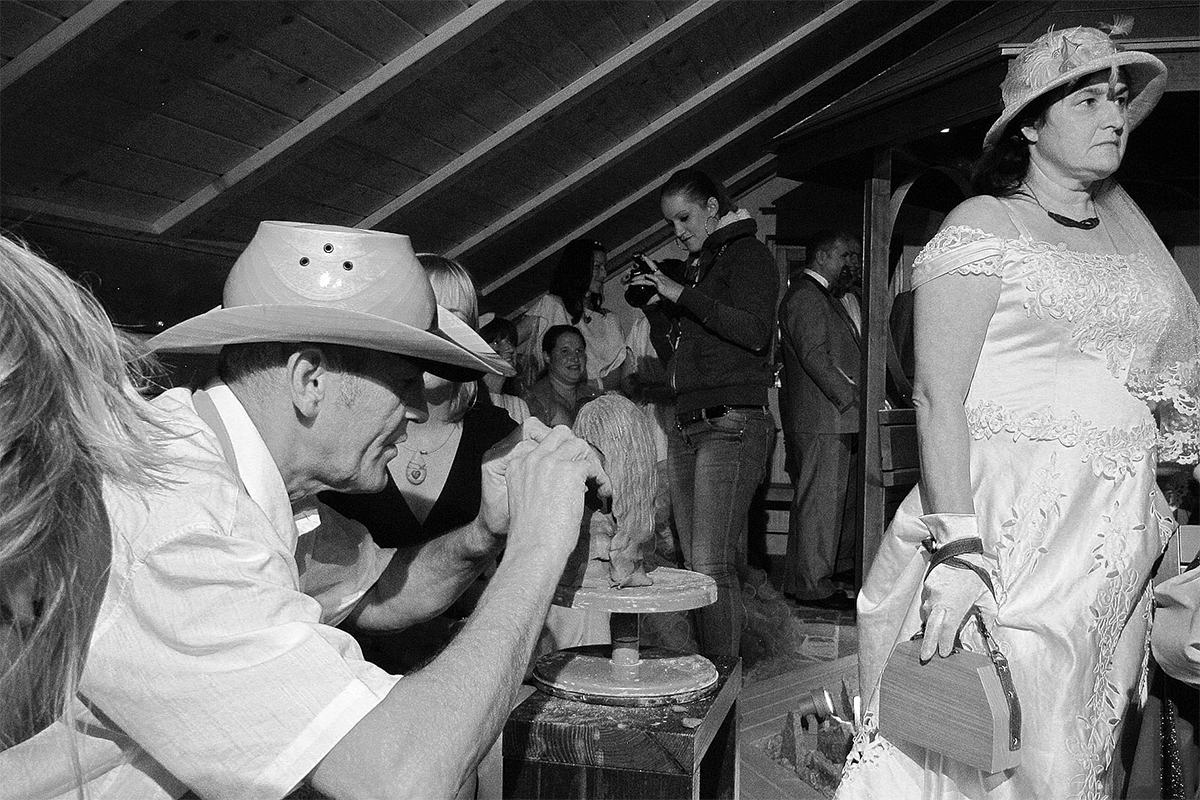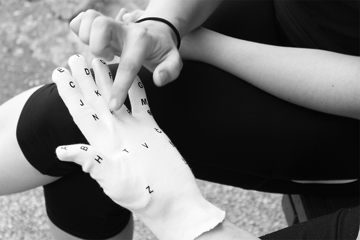 FB event | https://www.facebook.com/events/818307124955087/Gospa v sredini ima na hrbtu bele majice narisano dlan. Na njej so označene črke abecede. Z dotikom posamezne črke gluhoslepi izpišejo besedo in se na tak način sporazumevajo z okolico.