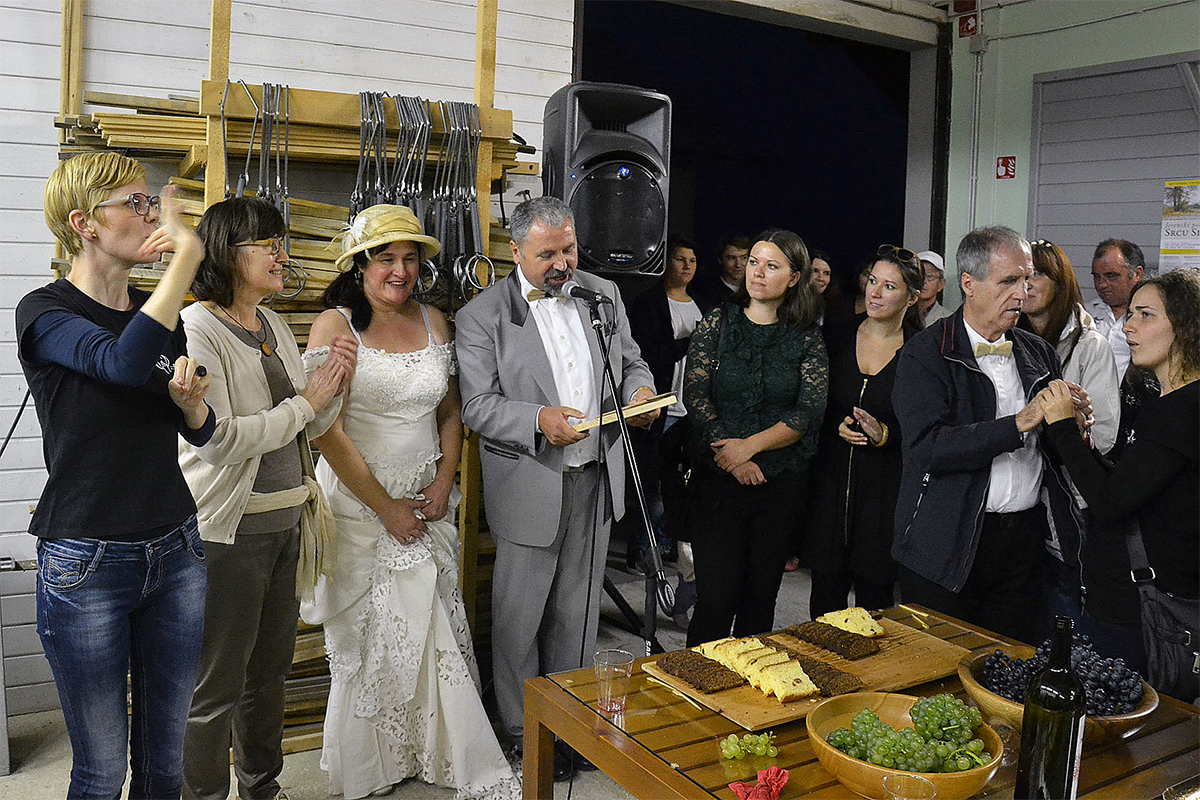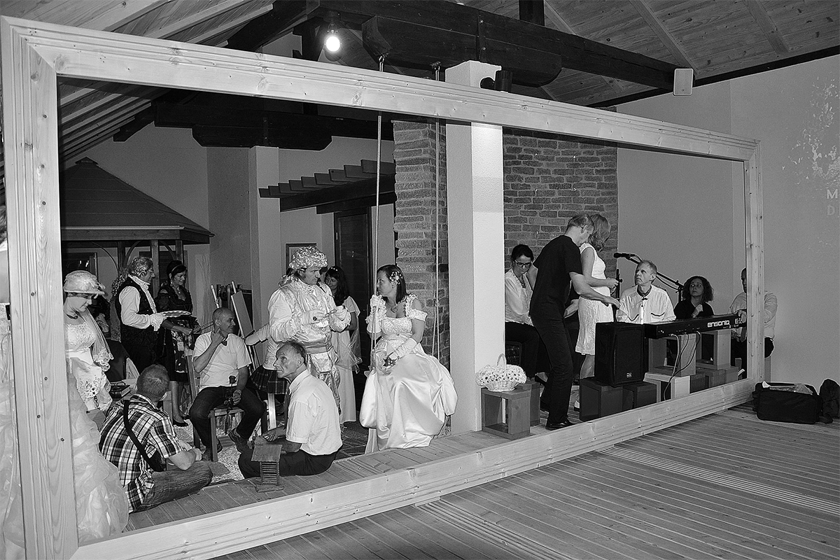 FB event | https://www.facebook.com/events/818307124955087/ Slepi pianist nežno preigrava klavir. Ob njem sedijo gluhoslepi, eden od njih ob klavirju in z rokami - taktilno posluša glasbo. Na gugalnici je deklica, ki ne čuti svojih stopal. Poleg nje stoji moški, ki jo guga. Ob vodi stoji gluhoslepo dekle, ki tipa vodo, z zalivalko. Za roko jo drži drugo dekle, ki ji pomaga. Ob strani grajskega vrta sedi grajski pisar in zapisuje zgodbo. Skoraj v temi mu jo narekuje grofica in se ozre na vrt za zvoki monokorda, ki ga prebirajo nežni prsti grajske vile. Ob njej stoji deklica metuljčica in se poigrava v lahnem vetrcu, vestalke se nalahno priklanjajo in prinašajo dobre želje. Vse to, sedeč v vrtni uti, opazujeta med sproščenim klepetom deklica z belimi lokvanji v naročju in njena spremljevalka, ki ji pomaga s svojimi koraki, saj sama ne zmore zaradi cerebralne paralize. Ob njima stojijo pevci, čakajoč, da se njihov glas sprehodi po tej nežni zgodbi in se dotakne srca, srca te žive slike. Na leseni klopci sedi gospodič in ustvarja kip iz gline. Niti slutiš ne, da je gluhoslep. Nemo ga opazuje deklica s skledo sadja v rokah. Na drugi strani vrta grajski slikarki v tišini in temi rišeta zgodbo, grof in pisarjeva gospa jima podajata barve. V tišini izdeluje na robu te slike gluhi (z okvaro vida) mizarski vajenec metuljčka iz lipovega lesa za slepega pianista. Medtem pa gluhoslepi grajski tesar izdeluje leseno hiško. Na vrtu opazim tudi rdečo vrtnico, ki jo drži v rokah zamišljeni gluhoslepi mladenič. Deklica na gugalnici zaspi in sanja o gozdu in vsej lepoti, ki jo opazi njeno oko. Sanja o glasovih, ki jih sliši, o korakih, ki jo nosijo po lahkih gozdnih poteh. Ko grajski pisar zapiše zgodbo, deklico prebudi iz sanj rahel tlesk rok. Mladenič se ji približa, jo objame in ji podari vrtnico. Njen nasmeh se zave topline objema in spoznanja, da ni sama. Spoznanja, kaj vse zmore, zato, ker je nekdo ob njej. Počuti se ljubljeno in sprejeto. Živa slika je zapisana v objemu, konča se s čutnim plesom vestalk.